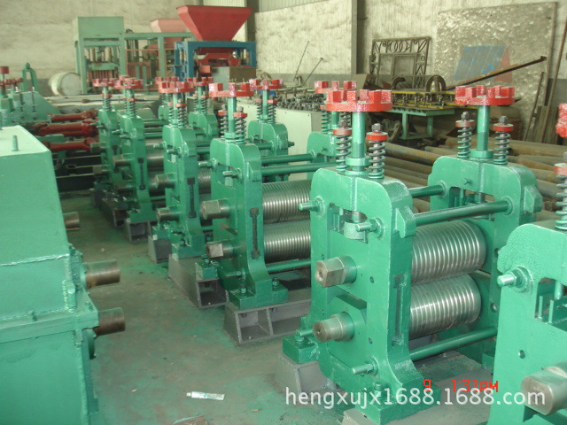 連續(xù)小型軋機(jī)所用坯料一般是連鑄小方坯,邊長一般是130-160mm,長度一般6-12m左右,坯料單重1.5-3噸。軋制線多為平立交替布置,實現(xiàn)全線無扭轉(zhuǎn)軋制,根據(jù)不同坯料規(guī)格和成品尺寸有18、20、22、24架的小型軋機(jī),18架為主流。目前棒材軋制多采用步進(jìn)式加熱爐、高壓水除鱗、低溫軋制、無頭軋制等新工藝,粗軋、中軋則向大坯料及提高軋制精度方向發(fā)展,精軋機(jī)主要是提高精度和速度,較高速度可達(dá)18m/s,產(chǎn)品規(guī)格一般為Ø10-40mm,也有Ø6-32mm或Ø12-50mm的。生產(chǎn)的鋼種為市場大量需求的低中高碳鋼、低合金鋼。其生產(chǎn)工藝流程是:步進(jìn)式加熱爐→粗軋機(jī)→中軋機(jī)→精軋機(jī)→水冷裝置→冷床→冷剪→自動計數(shù)裝置→打捆機(jī)→切料臺架。