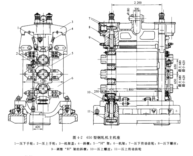 圖4-2所示為650型鋼軋機主機座,主機座中上,中,下三個軋輥旋轉方向固定不變,在中下輥之間交替過鋼,實現(xiàn)多道次往復軋制。中輥位置固定,上下輥分別通過壓下裝置和壓上裝置進行徑向調整,以保證孔型的要求。壓上,壓下均采用手動裝置,軋輥在軋制過程中實不調整的,只有在換輥之后和軸瓦磨損時才進行調整。上輥的調整量小,一般采用簡單的彈簧平衡。