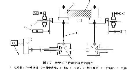上傳動(dòng)的立輥是指主傳動(dòng)裝置放在上面,用萬向接軸傳動(dòng)立輥。采用上傳動(dòng)可改善傳動(dòng)裝置的工作條件。圖5-4所示為上傳動(dòng)立輥傳動(dòng)簡圖。