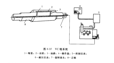 VC輥系統(圖 6-37)由 VC輥、液壓動力裝置、控制裝置和操作盤等組成。VC輥包括輥套、芯軸、油腔、油路和旋轉接頭等。在輥套和芯軸之間是油腔,軸套兩端緊密地熱裝在芯軸上,以便使其在承受軋制力的同時能耐高壓密封。液壓動力裝置的高壓油經旋轉接頭向輥子供油,通過控制高壓油使輥套膨脹,以補償軋輥撓度。油壓為0~50MPa,軋輥凸度在較大壓力下,沿半徑方向較大凸度軋鋼時可達0.27mm,軋鋁時可達0.33mm。