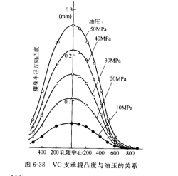 圖6-38所示為 VC支承輥凸度與油壓的關系,軋輥凸度的形式類似于正弦曲線,且軋輥的中間凸度值與壓力成正比。較大凸度取決于VC輥的結構,因此,選擇適合于軋制條件的輥套型式,即能夠獲得理想的軋輥凸度。圖6-38是在工作壓力為0~50MPa,響應速度為10MPa/s,調壓精度為0.5%,采用多元醇脂油和旋轉接頭的較大轉數為 500r/min 的條件下做出來的。