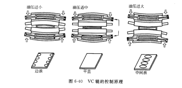 由于四輾軋機軋制負荷大,且工作輥直徑較小,因此,在一般四輾軋機上,都將支承輥用作 VC輥。其控制方法如圖6-39 所示,控制原理如圖 6-40 所示。油壓過小將使帶材產生邊浪,油壓過大將使帶材產生中間浪,只有油壓適中,才能獲得平直的帶材。