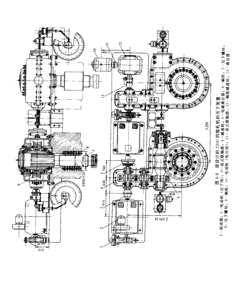 在 2300四輥熱軋鋼板軋機上有兩組壓下裝置,如圖 6-7、圖6-8所示。軋機的壓下速度為 2~12mm/s。兩組壓下裝置可以同時壓下調整,也可以在脫開電磁離合器5后進行單獨壓下調整。