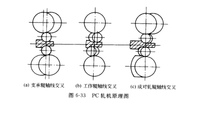 PC軋機基本上是一種四輥軋機,與一般四輥軋機主要不同之處是將平行布置的軋輥改變交叉布置。在軋制過程中,當離開中心的距離增大時,gun風也增大,一次來控制凸度,這與使工作輥凸度變化等效。就是說,PC軋機是利用調節軋輥軸線的交叉角度來控制凸度,是輥縫可調,而工作輥又不至于產生撓度。因此,凸度控制不會永祥工作輥的強度和剛度。軋輥軸線交叉布置可以有三種形式(見圖6-33):支撐輥軸線交叉布置:工作輥軸線交叉布置和承兌軋輥軸線交叉布置等。只要改變交叉角,就能改變軋輥凸度。工作輥軸線交叉布置時,軋輥凸度變化范圍較大,但是這種布置形式的軋機未能的到實際應用。因為這種形式布置的軋機,在公祖哦gun和支撐輥之間產生較大的相對滑動,使軋輥磨損和能量消耗大為增加。當支撐輥軸線交叉布置時,其效果同工作輥軸線交叉布置時一樣,在工作輥和支撐輥之間同樣產生相對滑動,使軋輥磨損和能量消耗大為增加。當軋輥軸線承兌交叉布置時,工作輥和支撐輥之間就不會產生相對滑動,這就消除了上述弊端,因此得到實際應用的PC軋機即時采用“承兌交叉”布置的軋機。