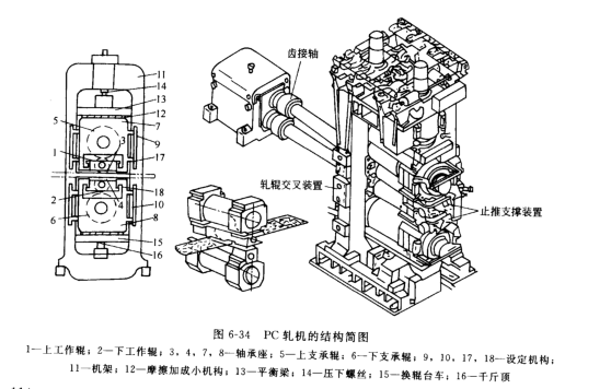 圖6-34所示為軋輥成對交叉布置的 PC軋機結構簡圖,上、下工作輾(1、2)的軸承座(3、4)分別裝在上 、下支承輥(5、6)的軸承座(7、8)中,上工作輾輸編與上支承輥軸線大致保持平行。上、下支承輥軸承座的位置設定機構(9、10)固定在機架(11)的兩側。上、下支承輥軸承座還能借助于驅動機構沿軋制方向移動,或保持在所定的位置上。上支承輥軸承座通過摩擦力減小機構 (12) 由平衡梁(13)來支承,而平衡梁通過壓下螺絲(14) 把軋制力傳給機架。 下面一對軋輥承受的軋制力通過摩擦力減小機構傳給換輥臺車(15),較后通過液壓千斤頂(16)傳給機架。上、下工作輾軸承座的位置設定機構(17、18)也可借助于驅動機構使上、下工作輥軸承座沿軋制方向移動,或固定在所定位置上。