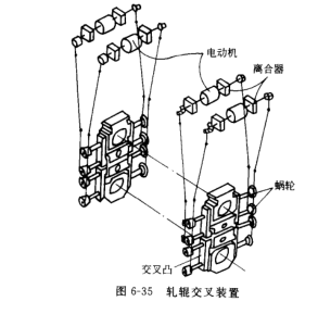 上、下交叉輥的傳動裝置用電機驅動,調整工作輥和支承輥軸承座的交叉頭是由電動機通過蝸輪減速機同時驅動的。當軋輥軸承座間隙過大時,交叉頭之間的擴大和縮小的微調是通過四臺電動機和八個離合器來完成的。