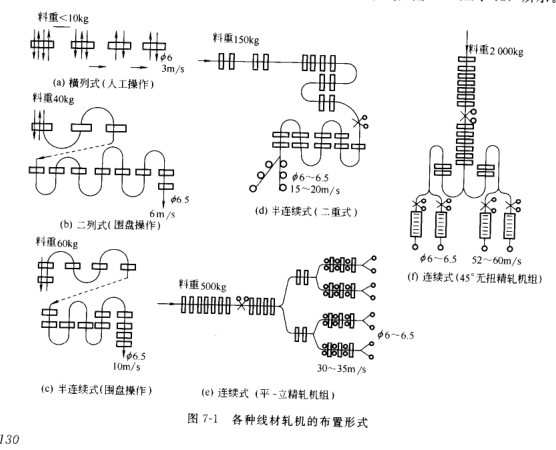 20世紀 50年代發展了半連續式線材軋機。粗軋機組布置成連續式,精軋機組布置成橫列式,中軋機組布置成連續式或橫列式。在機械化程度較高的半連續線材車間中,可以不用人工喂鋼,成品較高軋制速度可達16m/s,單重達到 200kg,年產量可達到 20 萬~35萬噸。半連續式線材軋機的布置形式如圖7-1(c)、(d)所示。